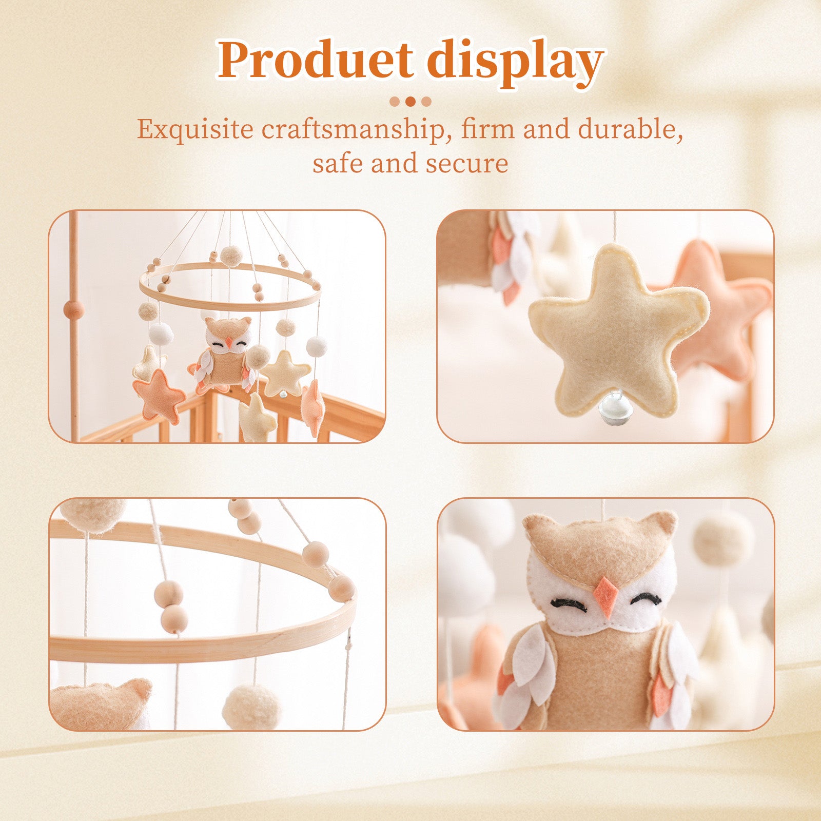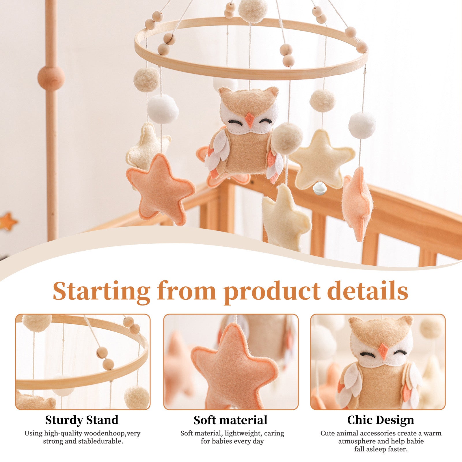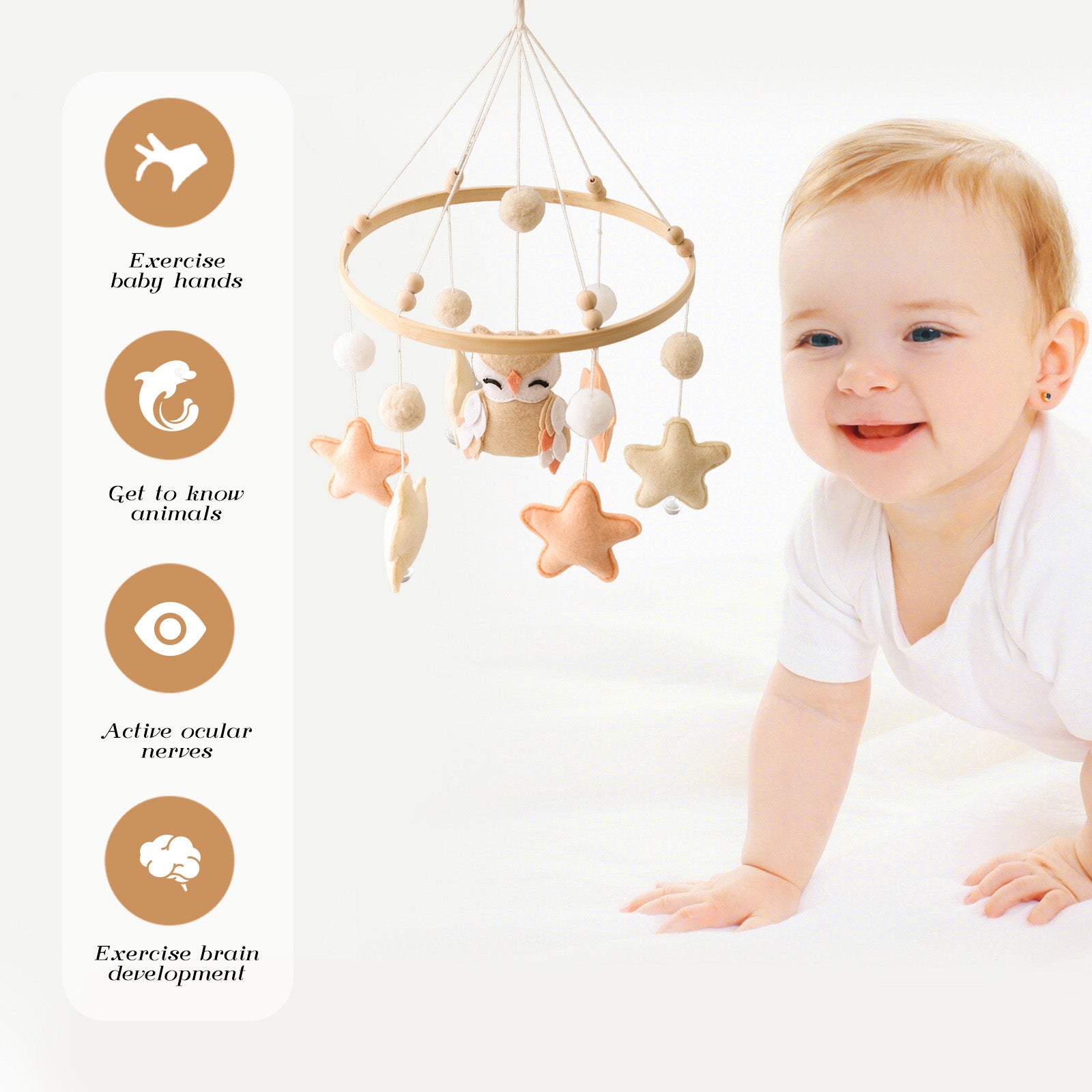 Beautiful baby mobile is in soft and natural colors - white and wood color. Neutral soothing color tones make this crib mobile be suitable for both baby boys and girls. Perfectly match any nursery decor or boho decor for any room of the house.